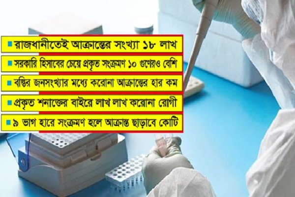 সরকারি তথ্যের কয়েক গুণ বেশি মানুষ করোনায় আক্রান্ত হওয়ার তথ্য এসেছে একটি আন্তর্জাতিক মানের জরিপে। এই জরিপ পরিচালনা করেছে খোদ সরকারি সংস্থা রোগতত্ত্ব, রোগ নিয়ন্ত্রণ ও গবেষণা প্রতিষ্ঠান (আইইডিসিআর)। জরিপ কাজে সহায়তা করেছে আন্তর্জাতিক উদরাময় গবেষণা সংস্থা-আইসিডিডিআর,বি’। গবেষণার তথ্য অনুযায়ী ঢাকায় অন্তত ১৮ লাখ মানুষ করোনা আক্রান্ত। ঢাকার মতোই সারা দেশে এই হারে সংক্রমণ হয়ে থাকলে সারা দেশে আক্রান্তের সংখ্যা কোটির বেশি হতে পারে। সরকারি সংস্থার এ জরিপের ফলে দেশে নতুন করে শঙ্কা দেখা দিয়েছে। অশনাক্ত এই লাখ লাখ আক্রান্তের মাধ্যমে পরিস্থিতি যে কোনো সময় খারাপ মোড় নিতে পারে। বিশেষ করে আসন্ন শীত মওসুমে সংক্রমণ হার বাড়ার আশঙ্কা জানিয়ে বিশেষজ্ঞরা এখনই প্রস্তুতি নেয়ার কথা বলছেন।