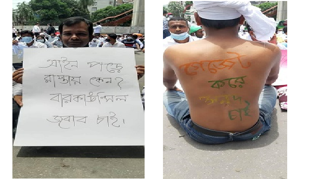 আজকের কর্মসূচিতে শিক্ষানবীশ আইনজীবীরা তাদের দাবি সম্বলিত— আইন পড়ে রাস্তায় কেন? বার কাউন্সিলের জবাব চাই, গেজেট করে সনদ চাই, বেতন নেই ভাতা নেই আইনজীবী হিসেবে স্বীকৃতি চাই— প্ল্যাকার্ড হাতে নিয়ে বিক্ষোভ দেখায়।