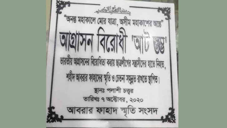 মঙ্গলবার মধ্যরাতে ডাকসুর সাবেক সমাজসেবা সম্পাদক আখতার হোসেনের নেতৃত্বে বাংলাদেশ ছাত্র অধিকার পরিষদের নেতাকর্মীরা ‘আবার ফাহাদ স্মৃতি সংসদ’ ব্যানারে এই স্তম্ভ তৈরি করেন। আখতার নিজেকে আবরার ফাহাদ স্মৃতি সংসদের আহ্বায়ক হিসেবে দাবি করছেন। স্মৃতিস্তম্ভের ফলকে লেখা হয়েছে ‘অনন্ত মহাকালে মোর যাত্রা, অসীম মহাকাশের অন্তে’। আবরার ফাহাদ তার ফেসবুক প্রোফাইলেও ওই উক্তি ব্যবহার করেছিলেন। ওই ফলকে আরও লেখা হয়েছে, ‘আগ্রাসনবিরোধী ‘আট স্তম্ভ’। ভারতীয় আগ্রাসনের বিরোধিতা করায় ছাত্রলীগ সন্ত্রাসীদের হাতে নিহত শহীদ আবরার ফাহাদের স্মৃতি ও চেতনা সমুন্নত রাখতে স্থাপিত।’