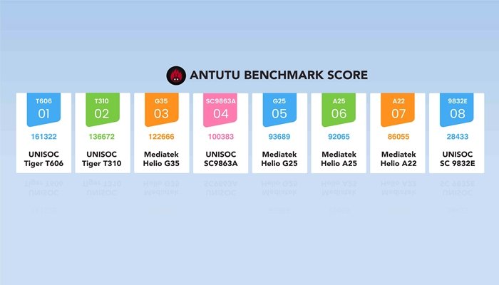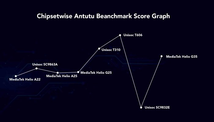 অন্যদিকে একই ক্যাটাগরির ফোনে ব্যবহৃত অন্যান্য চিপসেট যেমন ইউনিসক টি৩১০ এর স্কোর ১৩৬৬৭২, মিডিয়াটেক হেলিও জি৩৫ এর স্কোর ১২২৬৬৬, ইউনিসক এসসি৯৮৬৩এ এর স্কোর ১০০৩৮৩, মিডিয়াটেক হেলিও জি২৫ এর স্কোর ৯৩৬৮৯, হেলিও এ২৫ এর স্কোর ৯২০৬৫ এবং হেলিও এ২২ এর স্কোর ৮৬০৫৫।