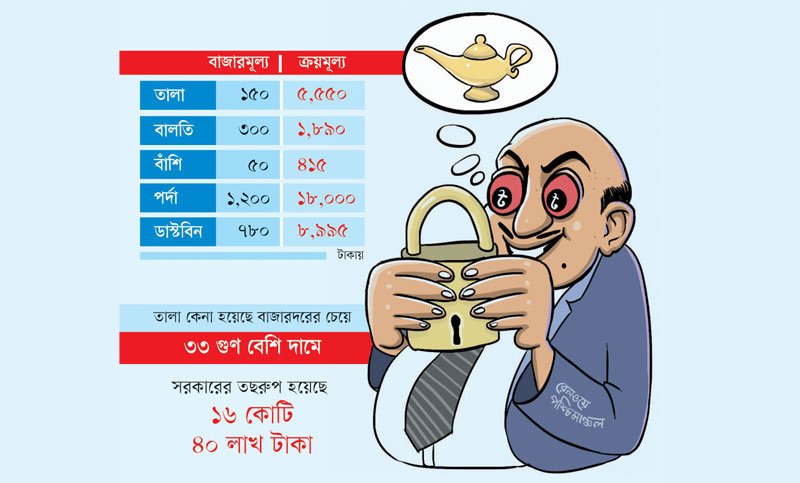 নিরীক্ষা প্রতিবেদনে বলা হয়েছে, বেশির ভাগ ক্ষেত্রে ঠিকাদারি প্রতিষ্ঠানের সঙ্গে যোগসাজশ করে বেশি দামে মালপত্র কেনা হয়েছে। এতে তছরুপ হয়েছে সরকারের ১৬ কোটি ৪০ লাখ টাকা। সরবরাহ করা মালপত্রের মধ্যে রয়েছে ভিজিটিং চেয়ার, মাইল স্টিলের চেয়ার, স্টিলের আলমারি, ফাইল কেবিনেট, সেক্রেটারি টেবিল, কাঠের চেয়ার, রিভলবিং চেয়ার, ক্রোকারিজ মাল, সোফা সেট, প্রতিবন্ধী হুইলচেয়ার ইত্যাদি।