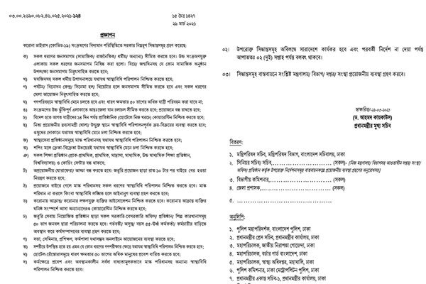 প্রধানমন্ত্রীর মুখ্যসচিব ড. আহমদ কায়কাউস স্বাক্ষরিত এ নির্দেশনায় বলা হয়েছে সকল ধরনের জনসমাগম সীমিত করতে হবে। উচ্চ সংক্রমণযুক্ত এলাকায় সকল ধরনের জনসমাগম নিষিদ্ধ। বিয়ে ও সামাজিক অনুষ্ঠানে জনসমাগম নিরুৎসাহিত করতে হবে।