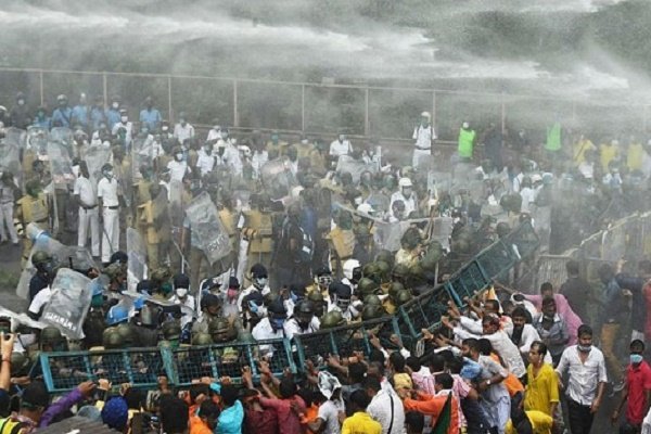 মিছিলকারীরা অবশ্য সেই নির্দেশে কান না দিয়েই ব্যারিকেড ভাঙ্গার চেষ্টা করতে থাকেন। তখনই পুলিশের সঙ্গে ধস্তাধস্তি শুরু হয়। পুলিশ প্রথমে লাঠি চালায়, তারপরে কাঁদানে গ্যাসের শেল ফাটায়। সবশেষে বেগুনি রঙ গোলা জল স্প্রে করা শুরু হয় জল-কামান থেকে। বিজেপি কর্মীরা ভাঙচুরও চালান, ব্যাপক ইঁট বৃষ্টি হয়।