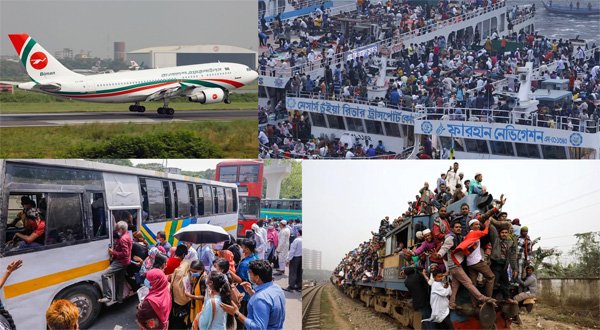 একই অবস্থা রেলপথেও। সকালে কমলাপুর রেলস্টেশনে গিয়ে দেখা যায়, টিকিট কাউন্টারে মানুষের দীর্ঘ সারি। কোথাও কোনও সামাজিক দূরত্ব নেই। নেই স্বাস্থ্যবিধি। স্টেশনে মাইকিং করে স্বাস্থ্যবিধি অনুসরণে যাত্রীদের সচেতন করা হচ্ছে।