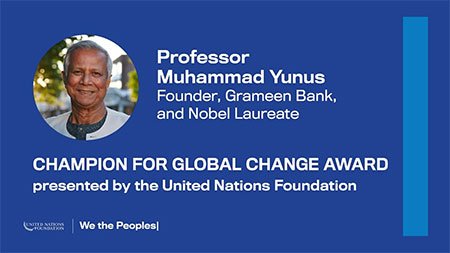 নোবেল লরিয়েট প্রফেসর মুহাম্মদ ইউনূসকে এ বছর জাতিসংঘ ফাউন্ডেশনের “চ্যাম্পিয়ন অব গ্লোবাল চেঞ্জ” পুরস্কার প্রদান করা হয়েছে।তার সাথে এই পুরস্কার পেয়েছেন বিশ্ব বাণিজ্য সংস্থার মহাপরিচালক ড. এনগোজি ওকনজো—ইওয়েইলা।