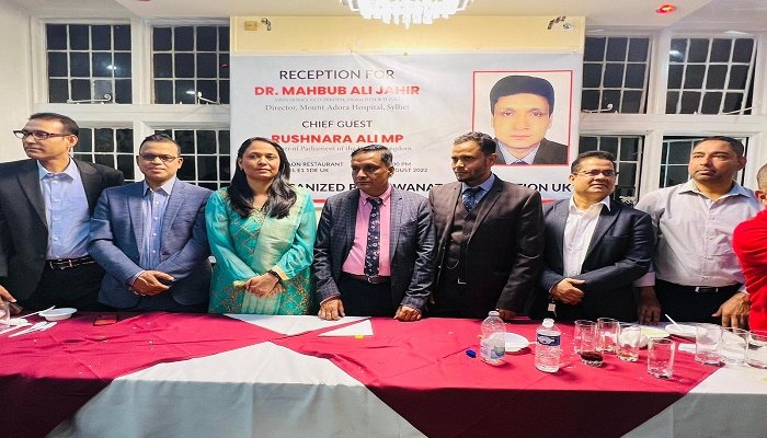 যুক্তরাজ্য সফররত সিলেটের মাউন্ট এডোরা হাসপাতালের পরিচালক ডা. মাহবুব আলী জহিরের সম্মানে বিশ্বনাথ ফাউন্ডেশন ইউকের উদ্যোগে গত ৩১ আগস্ট বুধবার হোয়াইটচাপেলের সোনারগাঁও রেস্টুরেন্টে সংবর্ধনা সভা অনুষ্ঠিত হয়। এতে সভাপতিত্ব করেন সংগঠনের সহ সভাপতি কমিউনিটি ব্যক্তিত্ব মনির উদ্দিন বশির। যৌথভাবে সভা পরিচালনা করেন সংগঠনের সাধারণ সম্পাদক জেএমজি এয়ারকার্গোর ব্যবস্থাপনা পরিচালক মনির আহমদ এবং সামাদুর রহমান রাহিন।