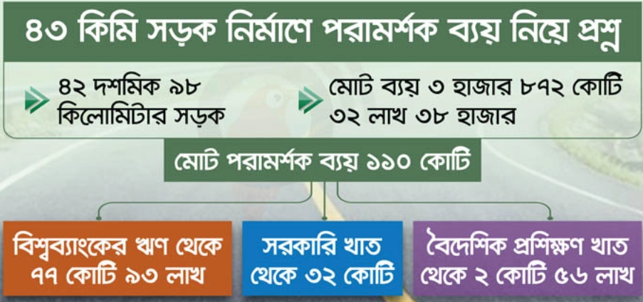 মাত্র ৪২ দশমিক ৯৮ কিলোমিটার সড়ক নির্মাণের জন্য এত টাকা খরচ করে পরামর্শক নিয়োগ দেওয়ার বিষয়টি ‘যৌক্তিক নয়’ বলে মত দিয়েছে পরিকল্পনা কমিশন। পরামর্শক খাতের জনমাস ও ব্যয় পুনঃপর্যালোচনা করে যৌক্তিকভাবে ব্যয় কমানোর বিষয়ে একমত কমিশন। এমনকি কিছু খাতে অযৌক্তিক ব্যয় বাদ দেওয়ারও পরামর্শ দেওয়া হয়েছে।