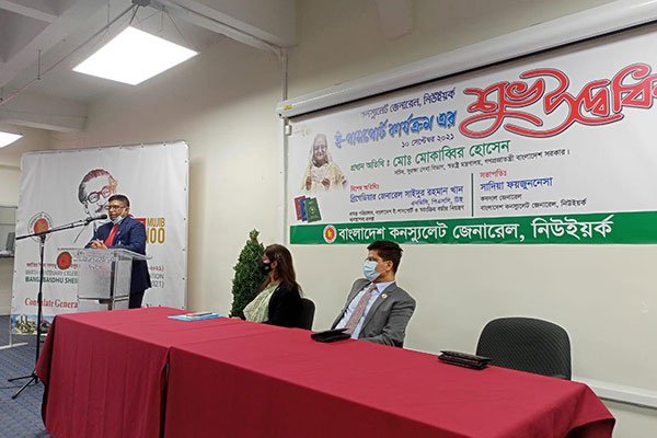 কনসাল জেনারেল সাদিয়া ফয়জুননেসা তাঁর বক্তব্যে আজকের দিনটিকে কনস্যুলেটের জন্য একটি অত্যন্ত তাৎপর্যপূর্ণ হিসেবে উল্লেখ করে বলেন, বাংলাদেশের স্বাধীনতার সুবর্ণ জয়ন্তী এবং বঙ্গবন্ধু শেখ মুজিবুর রহমান এর জন্মশতবার্ষিকীর এই ঐতিহাসিক ও আনন্দঘন মুহূর্তে নিউইয়র্কে বাংলাদেশ কনস্যুলেট জেনারেল ই-পাসপোর্ট সেবার শুভ সূচনা করল।