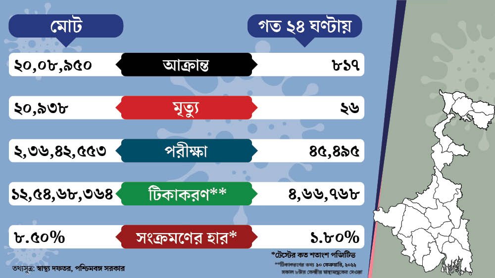 বৃহস্পতিবার রাজ্য স্বাস্থ্য দফতর প্রকাশিত বুলেটিন অনুযায়ী, গত ২৪ ঘণ্টায় রাজ্যে নতুন করে সংক্রমিত হয়েছেন ৮১৭ জন।