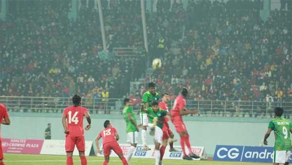 ম্যাচ আধঘণ্টায় যাওয়ার আগেই অঞ্জন বিশতার শট ক্রসবারের উপর দিয়ে যায়। ৩৬ মিনিটে জামালের ফ্রি কিক থেকে মেহেদী হাসানের হেড লক্ষ্যভ্রষ্ট হয়। বিরতির আগে ব্যবধানে দ্বিগুন করে স্বাগতিকরা। ৪২তম মিনিটে সংযোগ নিখুঁত পাসে বল বাড়িয়ে দেন বক্সে। বিশাল রায় ঢুকেই ডান পায়ের শটে লক্ষ্যভেদ করেন।