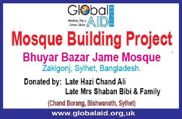 জয়নুল আবেদীন, লন্ডন: পূর্ব লন্ডনের চ্যারিটি সংস্থা গ্লোবাল এইড ট্রাস্ট এর মসজিদ নির্মাণ প্রকল্পের আওতায়, ট্রাস্টের ফান্ড রাইজিং অফিসার ও লন্ডন প্রবাসী প্রভাষক মোহাম্মদ জয়নুল আবেদিনের তত্ত্বাবধানে জকিগঞ্জের খলাছড়া ইউনিয়নাধীন ভুঁইয়ার বাজারে ভুঁইয়ার বাজার মসজিদের ভিত্তি প্রস্তর স্থাপন করা হয়েছে।