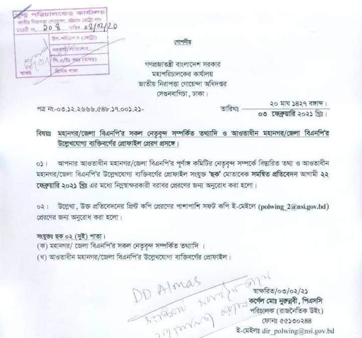 চিঠিতে জেলা/মহানগর বিএনপি’র কমিটি গুলোর নেতা ও সক্রিয় ব্যক্তিদের নাম এবং চক অনুযায়ী তথ্য সংগ্রহ করতে বলা হয়েছে।