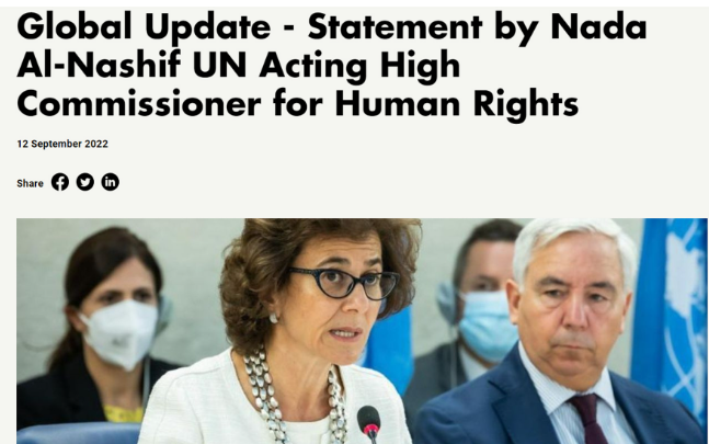 জাতিসংঘের মানবাধিকার কাউন্সিলের ৫১তম নিয়মিত অধিবেশনের উদ্বোধনী বক্তব্যে জাতিসংঘের মানবাধিকার বিষয়ক ভারপ্রাপ্ত হাইকমিশনার নাদা আল-নাশিফ আগের হাইকমিশনারের বক্তব্যের ওপর জোর দেন।