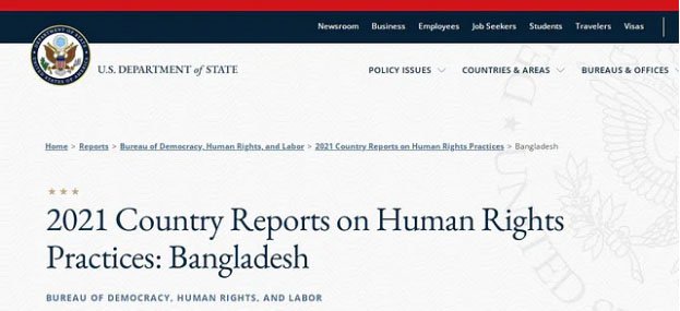 বাংলাদেশ নিউজ ডেস্ক: ২০২১ সালে বাংলাদেশে মানবাধিকার পরিস্থিতি নিয়ে যুক্তরাষ্ট্রের পররাষ্ট্র দপ্তরের বার্ষিক প্রতিবেদন মঙ্গলবার প্রকাশ করা হয়েছে। বাংলাদেশে আইনশৃঙ্খলা বাহিনী বিচারবহির্ভূত হত্যা ও গুমসহ নানা ধরনের নিপীড়নে জড়িত থাকলেও এর জন্য তাদের জবাবদিহি করা হয় না বলে যুক্তরাষ্ট্রের পররাষ্ট্র দপ্তরের এই প্রতিবেদনে বলা হয়েছে।