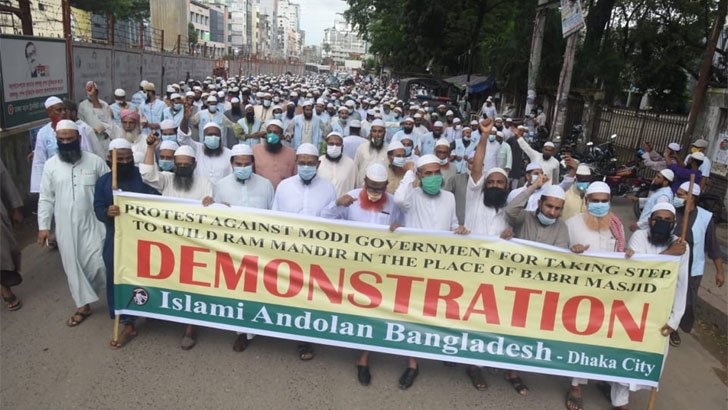 ভারতের অযোধ্যায় প্রায় ৫০০ বছর পুরনো বাবরি মসজিদের জায়গায় রামমন্দির নির্মাণের প্রতিবাদে ঢাকায় বিক্ষোভ করেছে চরমোনাই পীরের নেতৃত্বাধীন ইসলামী আন্দোলন বাংলাদেশ।