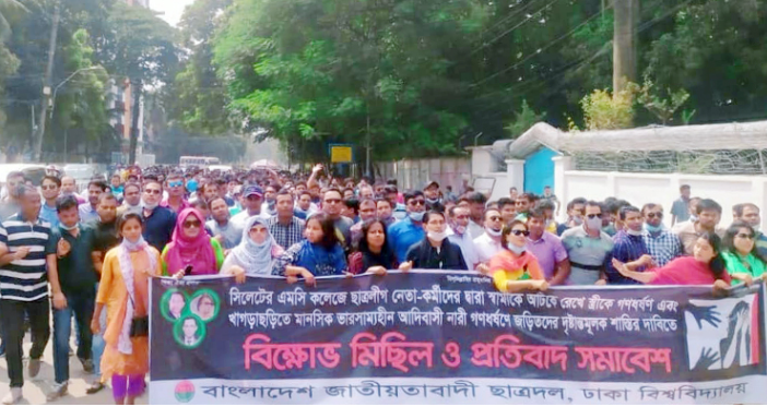 সিলেটের এমসি কলেজ, খাগড়াছড়ি ও সাভারের ধর্ষণের ঘটনার কথা উল্লেখ করে ছাত্রদলের সভাপতি ফজলুর রহমান খোকন বলেন, খাগড়াছড়ি আদিবাসী ধর্ষণ এবং সিলেট এমসি কলেজের ছাত্রলীগ ধর্ষকদের বিরুদ্ধে প্রতিবাদ সমাবেশ এবং বিক্ষোভ মিছিলের মাধ্যমে তীব্র নিন্দা জ্ঞাপন করছি। তিনি বলেন, ছাত্রলীগ ধর্ষণ কর্মের ধারাবাহিকতা অব্যাহত রেখেছে। এমসি কলেজের মাধ্যমে সেটা বোঝা যায়।