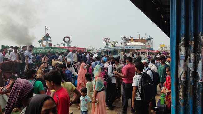 শিমুলিয়া-বাংলাবাজার নৌরুটে ১৭টি ফেরির মধ্যে সচল রয়েছে ৫টি। জরুরি ও পণ্যবাহী গাড়ি পারাপারের জন্য ফেরিগুলো সচল রাখা হলেও পার হচ্ছেন শত শত যাত্রী ও ব্যক্তিগত গাড়ি। এতে পারাপারের অপেক্ষায় থাকা পণ্যবাহী গাড়িগুলোকে দীর্ঘক্ষণ ঘাটে অপেক্ষা করতে হচ্ছে। আর অতিরিক্ত ভিড় থাকায় যাত্রীরা স্বাস্থ্যবিধি বা সামাজিক দূরত্ব কিছুই মানছেন না।