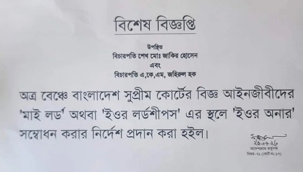 তখন সহকারী অ্যাটর্নি জেনারেল মাহফুজুর রহমান (লিখন) বলেন, আদালতকে সম্মান করে লর্ড সম্বোধন করা হয়। তখন আদালত বলেন, ‘মাই লর্ড’ বা ‘ইয়োর লর্ডশিপ’ না বলে ‘ইয়োর অনার’ বলে সম্বোধন করলেও তাঁরা সম্মানিত বোধ করবেন। পরে আদালত কক্ষের বাইরে এ–সংক্রান্ত বিজ্ঞপ্তি দেখা যায়।