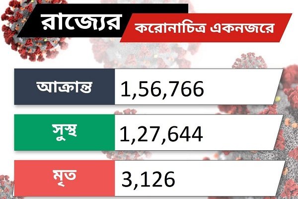 পশ্চিমবঙ্গ স্বাস্থ্য ও পরিবার কল্যাণ দফতরের সর্বশেষ রিপোর্ট অনুযায়ী, শনিবার (২৯ অগস্ট) পর্যন্ত রাজ্যে করোনা আক্রান্ত বেড়ে হয়েছে ১ লক্ষ ৫৬ হাজার ৭৬৬ জন। এর মধ্যে গত ২৪ ঘণ্টায় নতুন করে ৩ হাজার ১২ জনের কোভিড ধরা পড়েছে। তবে, দেড় লক্ষের উপর আক্রান্ত হলেও বাংলায় এই মুহূর্তে অ্যাক্টিভ আক্রান্তের সংখ্যা ২৫ হাজার ৯৯৬।