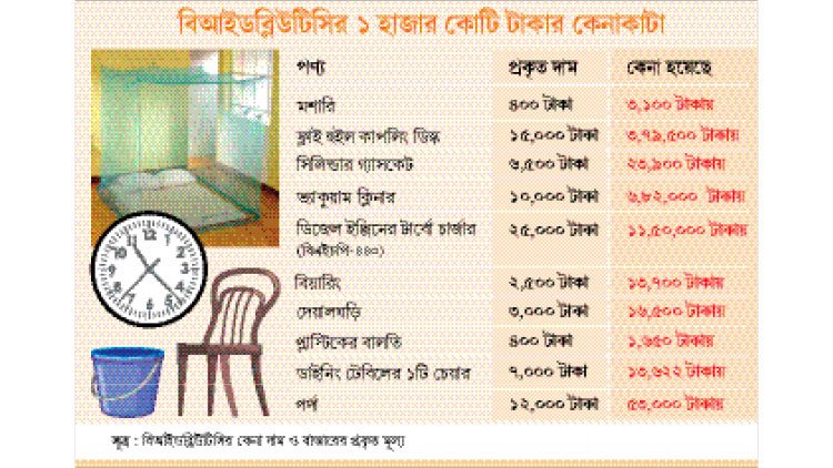 অস্বাভাবিক দামে কেনাকাটা: দেশের একটি আসবাব কোম্পানির কাছ থেকে চট্টগ্রামের বিআইডব্লিউটিসির একটি অতিথি কক্ষের জন্য ৩৪ লাখ টাকার কেনাকাটা করা হয়েছে। অভিযোগে বলা হয়েছে, একটি অতিথি কক্ষের জন্য ব্যয় হয়েছে ৮ লাখ টাকা। অথচ ব্যয় দেখানো হয়েছে ৩৪ লাখ টাকা। ব্যয়ের তালিকায় থেকে জানা যায়, একটি সাধারণ স্পঞ্জের স্যান্ডেল কেনা হয়েছে ৬০০ টাকায়, অথচ বাজারে সেটার দাম ১৫০ টাকা। ৩ হাজার টাকার একটি দেয়ালঘড়ি কেনা হয়েছে ১৬ হাজার ৫০০ টাকায়। ৪০০ টাকার একটি বালতি কেনা হয়েছে ১ হাজার ৬৫০ টাকায়। ১ হাজার ৫০০ টাকার একটি বিছানার চাদর কেনা হয়েছে ৫ হাজার ৯০০ টাকায়। ডাইনিং টেবিলের একেকটি চেয়ার কেনা হয়েছে ১৩ হাজার ৬২২ টাকায়, বাস্তবে এসব চেয়ারের প্রতিটির দাম ৭ হাজার টাকার বেশি নয়। ১২ হাজার টাকার পর্দা কেনা হয়েছে ৫৩ হাজার টাকায়।