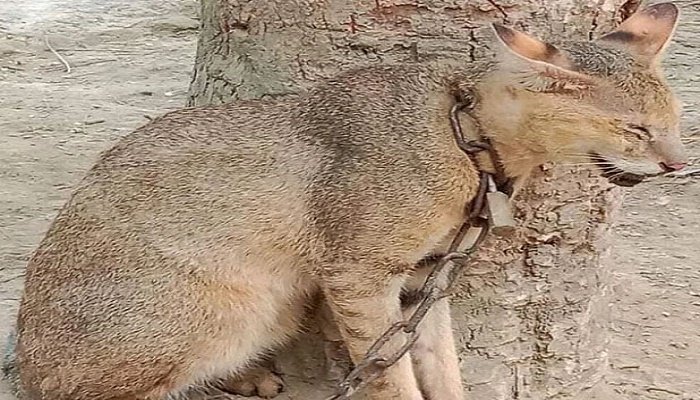 বন্য প্রাণী ব্যবস্থাপনা ও প্রকৃতি সংরক্ষণ বিভাগ এবং স্থানীয় সূত্রে জানা গেছে, শনিবার ভোরে বনবিড়ালটি খাবারের সন্ধানে নকলা উপজেলার দক্ষিণ নকলা গ্রামের মো. ফিরোজ মিয়ার বাড়িতে প্রবেশ করে। টের পেয়ে ওই বাড়ির লোকজন এটিকে আটক করে শিকল দিয়ে গাছের সঙ্গে বেঁধে রাখেন। পরে শনিবার দুপুরে স্থানীয় এক তরুণ গলায় শিকল বাঁধা অবস্থায় ওই বনবিড়ালের একটি ছবি সামাজিক যোগাযোগমাধ্যম ফেইসবুকে পোস্ট করেন। বিষয়টি অল্প সময়ের মধ্যে স্থানীয় লোকজন ও গণমাধ্যমকর্মীদের নজরে আসে। খবর পেয়ে জেলা বন্য প্রাণী ব্যবস্থাপনা ও প্রকৃতি সংরক্ষণ বিভাগের রেঞ্জ কর্মকর্তা মো. মঞ্জুরুল আলমের নেতৃত্বে বন বিভাগের কর্মকর্তারা বিকেলে দক্ষিণ নকলা গ্রামে গিয়ে বনবিড়ালটি উদ্ধার করেন ও তাঁদের হেফাজতে নেন। পরে শনিবার সন্ধ্যায় শেরপুর সদর উপজেলার মৃগী নদীর পাড়ে এটিকে অবমুক্ত করা হয়।