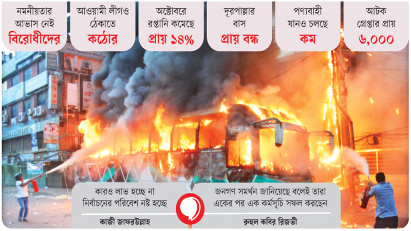 মানুষের ক্ষতি হলেও হরতাল-অবরোধকে নিরপেক্ষ নির্বাচনের দাবি আদায়ের পথ মনে করছে বিএনপি ও সমমনারা। আন্তর্জাতিক সহানুভূতি ‘ধরে রাখতে’ প্রাণহানি যাতে না হয়, সেদিকে গুরুত্ব দিচ্ছে দলগুলো। গ্রেপ্তার এড়াতে আত্মগোপনে থাকা বিএনপির নেতাদের কয়েকজন সমকালকে বলেন, মহাসমাবেশ পণ্ড করে দেওয়ার প্রতিবাদে ডাকা হরতালে জনগণের সমর্থন ছিল। অবরোধেও জনসমর্থন দেখা যাচ্ছে। তাদের দাবি, সে কারণেই মানুষ রাস্তায় নামছে কম।
