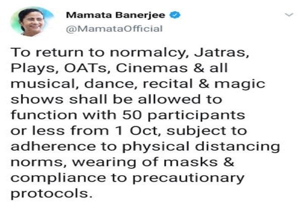 মুখ্যমন্ত্রী লিখেছেন “স্বাভাবিক ছন্দে ফেরার জন্য যাত্রা,নাটক,মুক্তমঞ্চ,সিনেমা,সমস্ত সঙ্গীত,নাচ,আবৃত্তি ও ম্যাজিক শ্যো চালু করার অনুমতি দেওয়া হচ্ছে। তবে এই সমস্ত অনুষ্ঠানে অনুষ্ঠানে সর্বোচ্চ ৫০-জন অংশগ্রহন করতে পারবে। ১ অক্টোবর থেকে এই সমস্ত কিছু শুরু হবে।শারীরিক দূরত্ব বিধি ও মাস্ক অবশ্যই ব্যবহার করতে হবে। সমস্ত করোনা প্রটোকল মানতে হবে।”